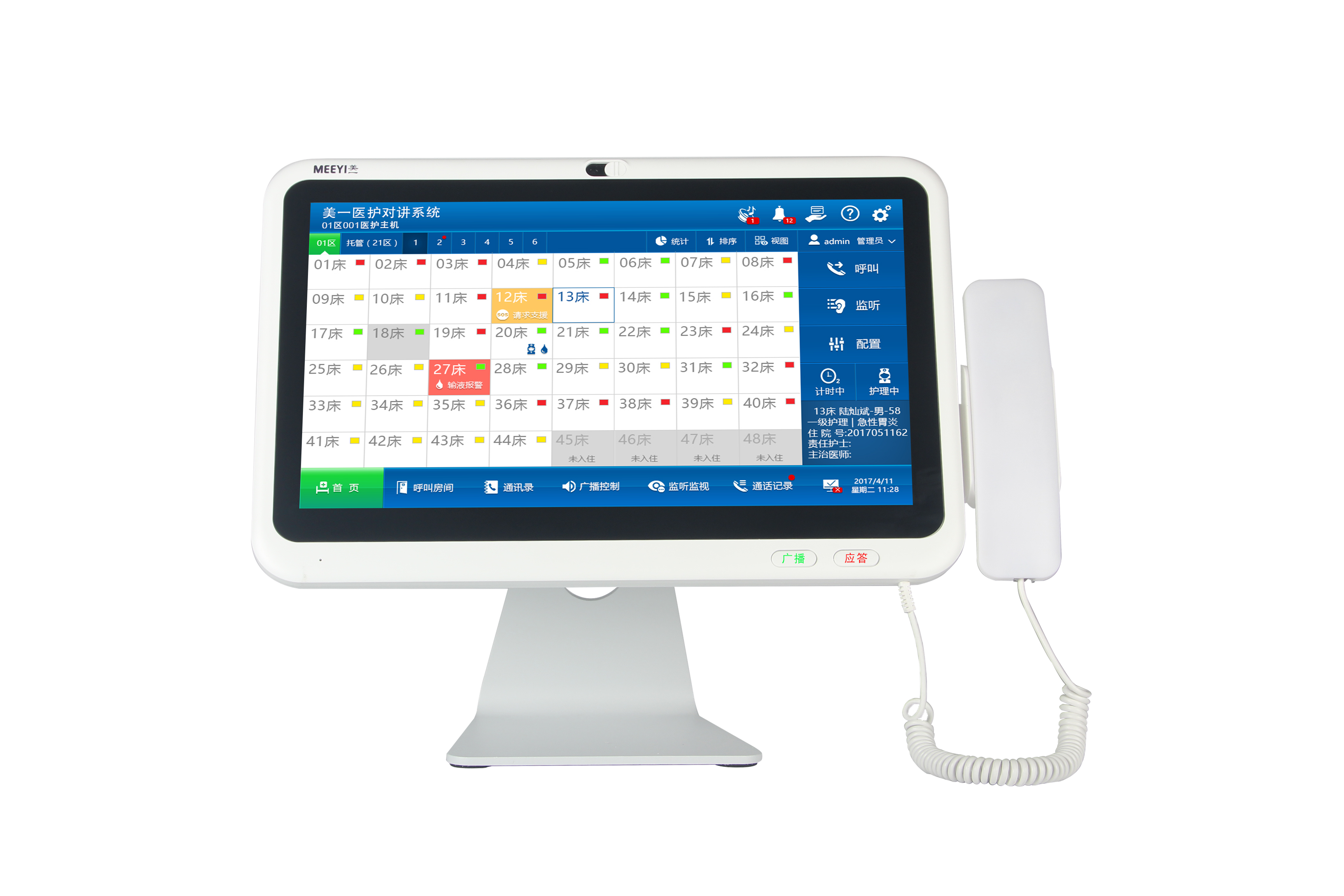 11. 分机呼叫时,主机和病房门口机的触摸屏上均同步显示呼入状态,主机语音播报“XX房 XX床 呼叫”;